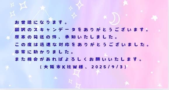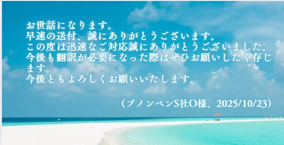 今回は英訳をお願いしましたが、他の言語でもまた宜しくお願いします。